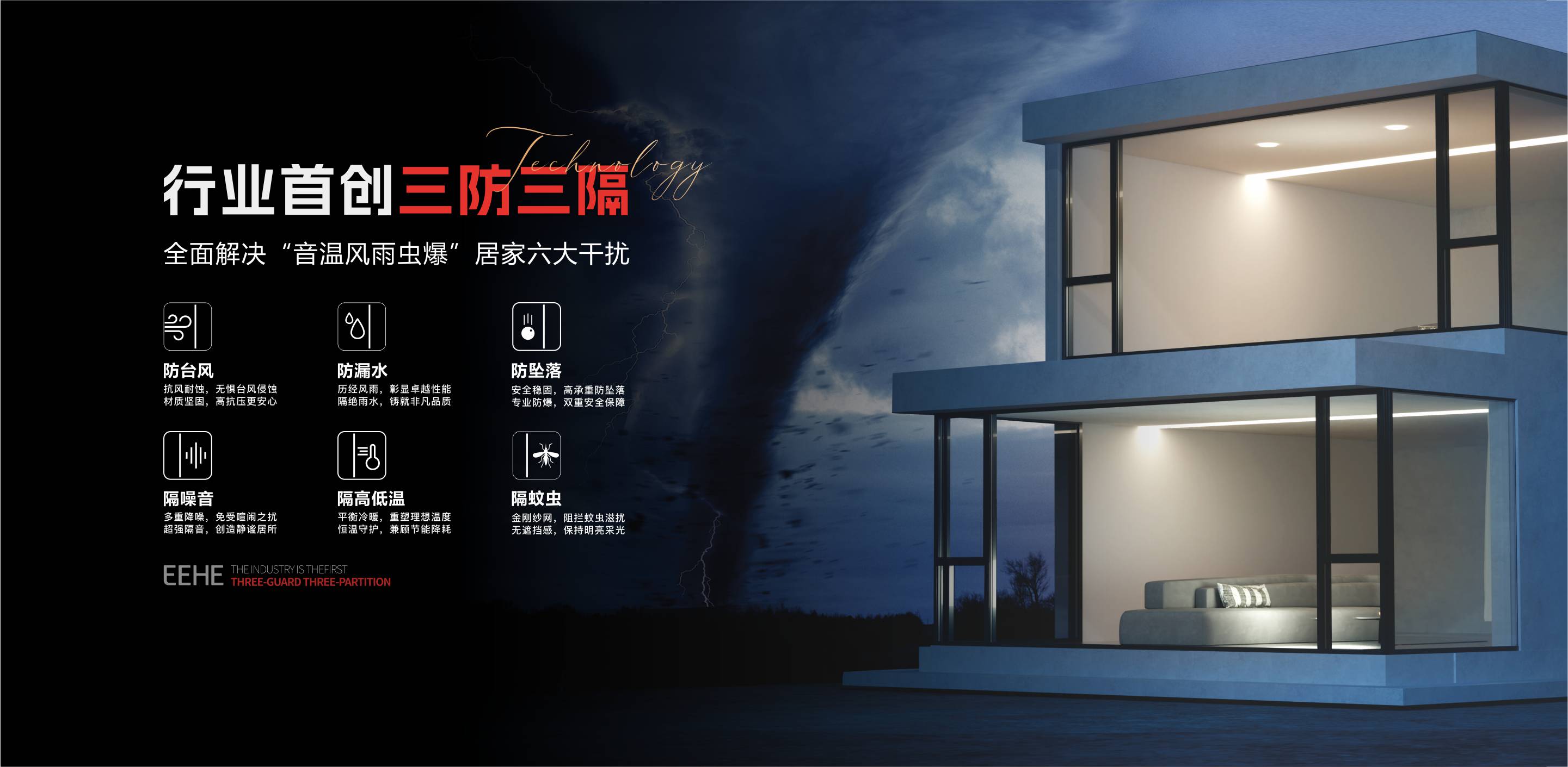 億合門窗通過“三防三隔”全防護系統,重新定義好門窗標準,解決消費者居家干擾問題,實現安全與舒適的兼顧。